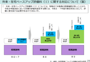 クリニックにおいては、現行の「外来・在宅ベースアップ評価料」の枠組みがベースとなりますが、評価に差がつく可能性があります。