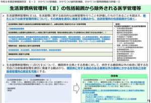 生活習慣病管理料(Ⅱ)は、生活習慣に関する総合的な治療管理を評価したものですが、これまで包括されていた医学管理料等の一部について、その実施を適切に推進する観点から包括範囲から除外されることになりました。