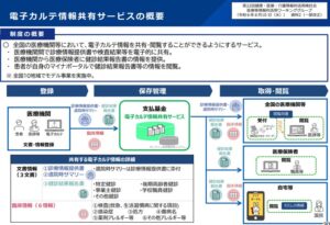 電子カルテ情報共有サービスは、全国の医療機関等において電子カルテ情報を共有・閲覧することができるようにするサービスです。支払基金が運営する「電子カルテ情報共有サービス」を通じて、診療情報提供書・退院時サマリー・健診結果報告書の3文書と、検査・感染症・処方・傷病名・薬剤アレルギー・その他アレルギーの6情報が共有されます。