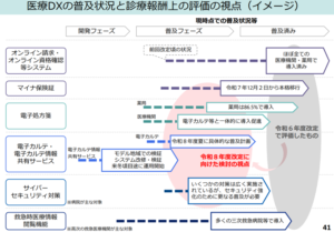 具体的には、マイナ保険証の利用率、電子処方箋の導入状況、電子カルテ情報共有サービスの普及度合いといった各種指標の進展に応じて、医療機関に求める要件を段階的に引き上げ、より包括的な体制整備を評価する加算へと再構成されています。