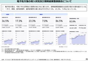 電子処方箋の導入状況を見ると、令和7年10月時点で薬局の導入率は86.5%と高水準である一方、病院は17.3%、医科診療所は23.3%、歯科診療所は7.0%にとどまっています。調剤結果登録割合(月間)は82.8%と高い水準ですが、医療機関側の導入が追いついていない現状が浮き彫りになっています。