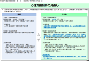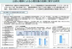 国立精神・神経医療研究センターの研究では、通院中の神経症性障害、ストレス関連障害、身体表現性障害等の患者に対して、通院精神療法に加えて公認心理師による心理支援を導入した場合、患者の状態のさらなる改善が認められました。こうしたエビデンスを踏まえて、今回の改定で心理支援加算の対象患者に「神経症性障害・ストレス関連障害・身体表現性障害」が追加されています。
