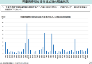 児童思春期支援指導加算の届出医療機関は都道府県ごとに大きく偏在しており、東京都(約39施設)、大阪府(約26施設)、愛知県(約27施設)に集中する一方で、3施設以下の都道府県も一定数あるという実態が明らかになりました。