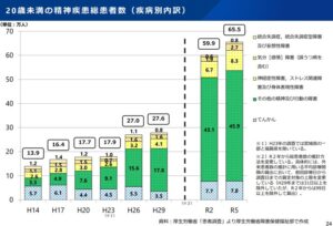 20歳未満の精神疾患総患者数は、平成14年の13.9万人から令和5年には65.5万人と約4.7倍に増加。特にR2年以降は、その他の精神および行動の障害、神経症性障害、ストレス関連障害、身体表現性障害が急増しています。